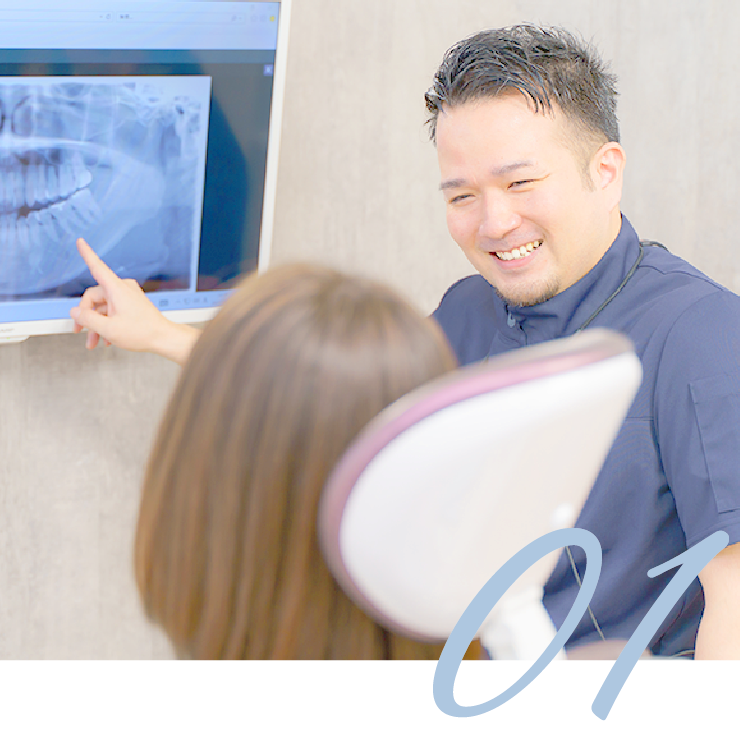 患者さまが納得できるまで説明するなど、対話を重視。お子さまからシニアの方まで誰もが安心できて、「家族に紹介したい」と思える歯科医院をめざしています。